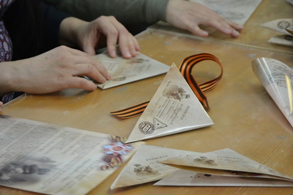 В преддверии праздника Великой Победы собравшиеся в библиотеке имени Симонова попытались сделать фронтовые треугольники.
