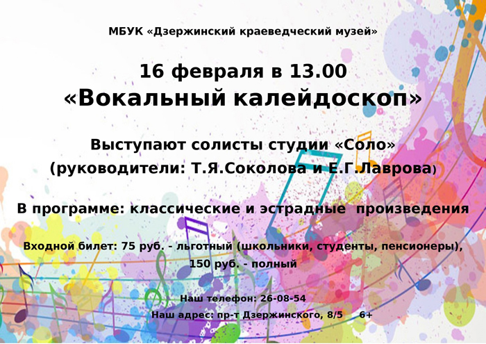 16 ФЕВРАЛЯ в 13.00 краеведческий музей Дзержинска приглашает всех желающих на "Вокальный калейдоскоп". Выступают солисты студии "Соло" (руководители: Т.Я.Соколова и Е.Г.Лаврова). В программе: классические и эстрадные произведения.