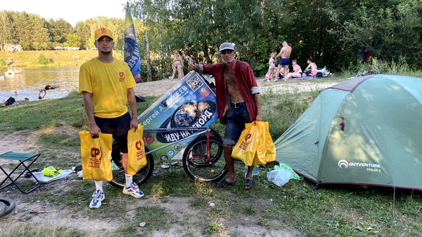 Также помогли поменять велосипедные покрышки на тележке, в которой находятся необходимые предметы для путешествия.