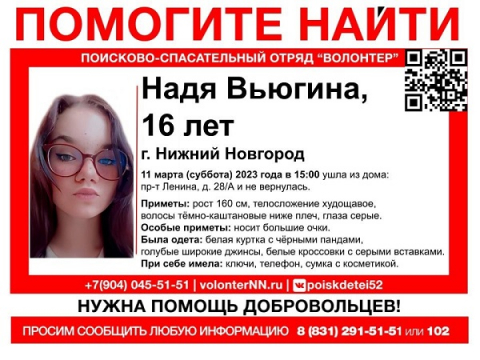 16-летняя Надя Вьюгина пропала в Нижнем Новгороде 11 марта. Об этом сообщает поисково-спасательный отряд «Волонтер».
