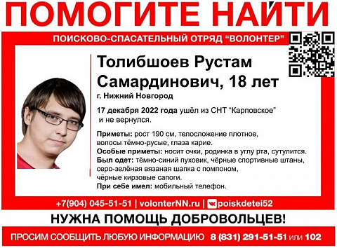 Всех, кто обладает какой-либо информацией о местонахождении Рустама Толибшоева, просят позвонить по телефонам: 8(831)291-51-51 или 102.