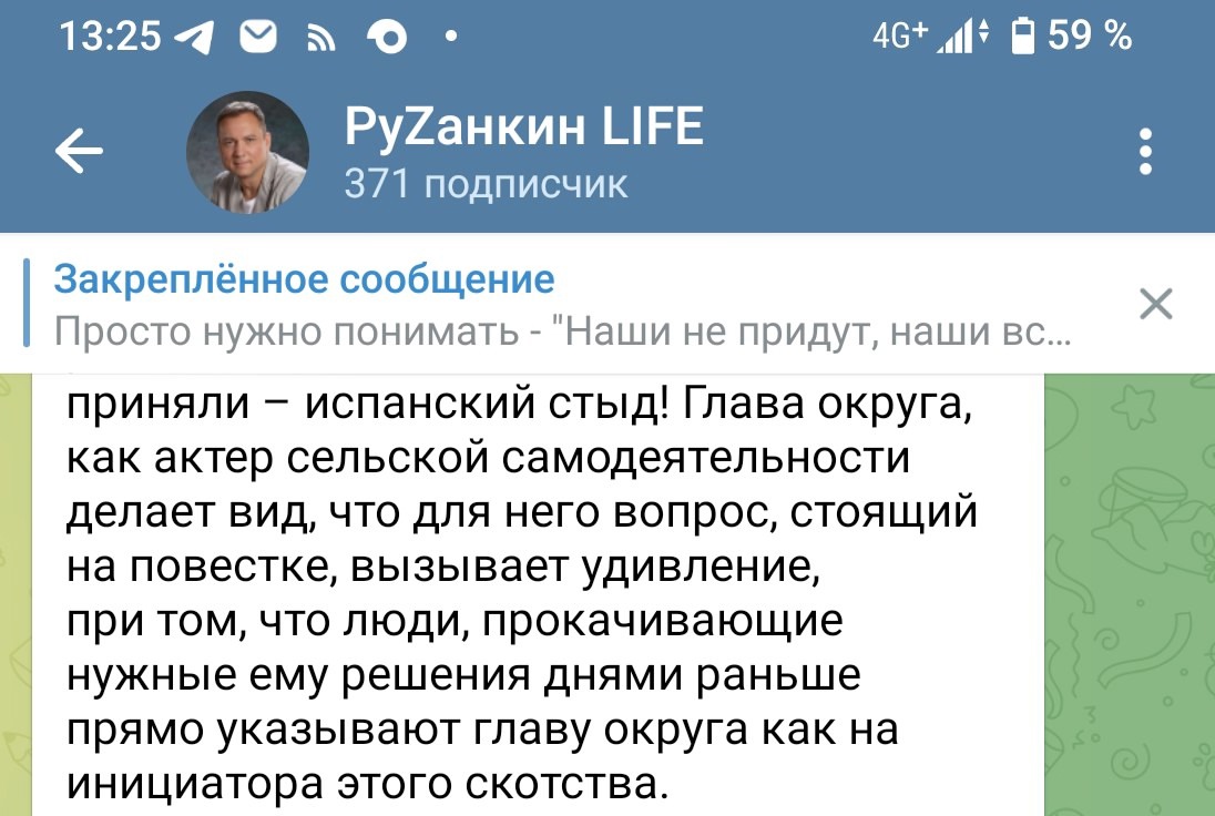 "Глава округа, как актер сельской самодеятельности делает вид, что для него вопрос, стоящий на повестке, вызывает удивление, притом, что люди, прокачивающие нужные ему решения днями раньше, прямо указывают на главу округа как на инициатора этого скотства", - написал Рузанкин.