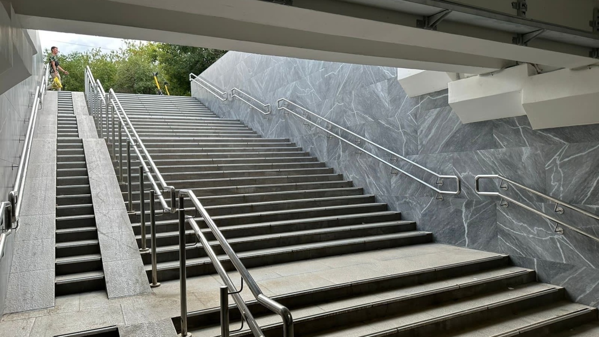 Специалисты установили водоотводные лотки и греющие кабеля на лестничных сходах. Это поможет предотвратить их обледенение зимой. Также в переходе обновили перила и пандусы для маломобильных граждан, добавили дополнительно освещение. В качестве облицовки была использована керамическая плитка под «мрамор» в серых оттенках.