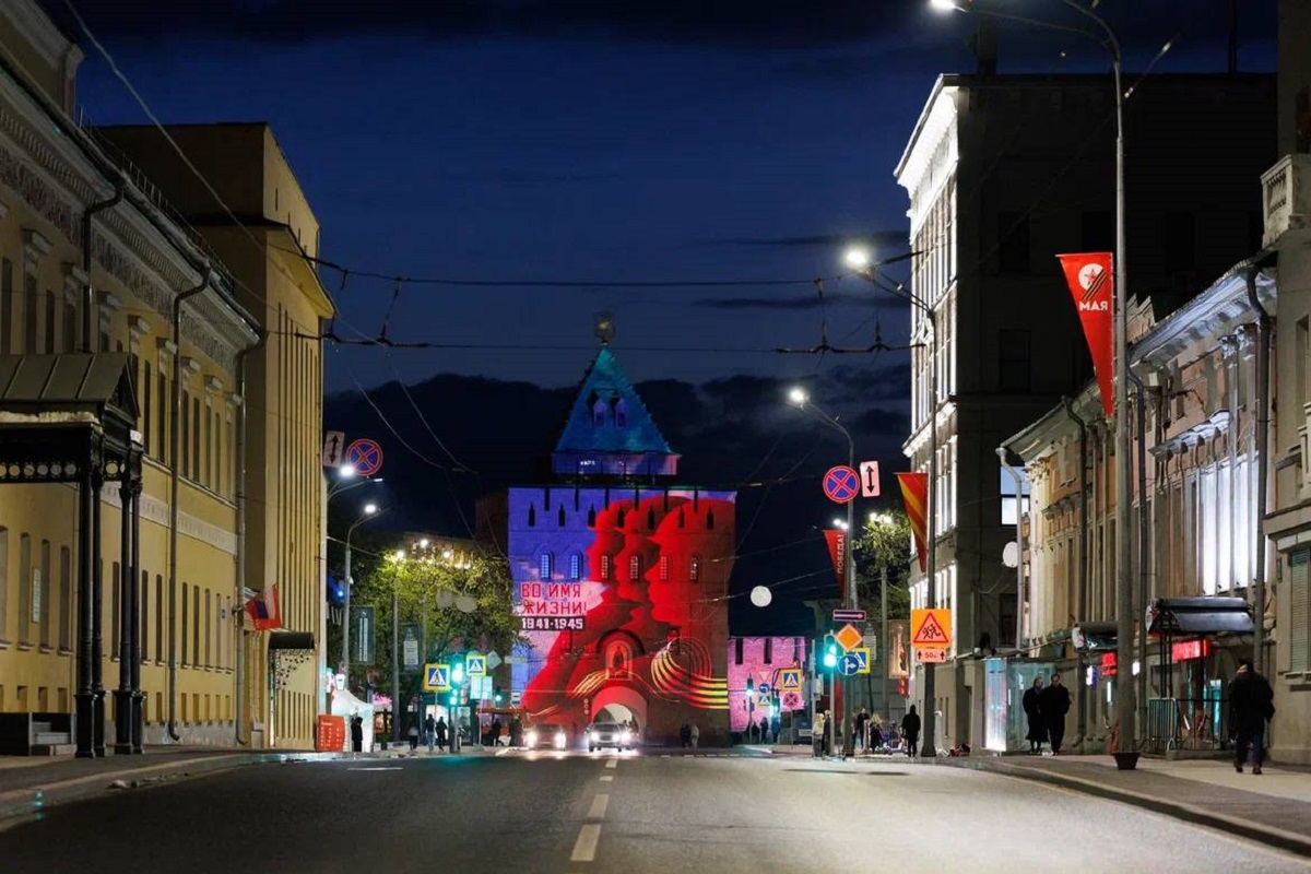 Праздничное световое шоу украсило Дмитриевскую башню Нижегородского кремля 9 мая в честь 79‑й годовщины Великой Победы. Благодаря 3D-мэппингу ожила история Нижнего Новгорода в годы Великой Отечественной войны.