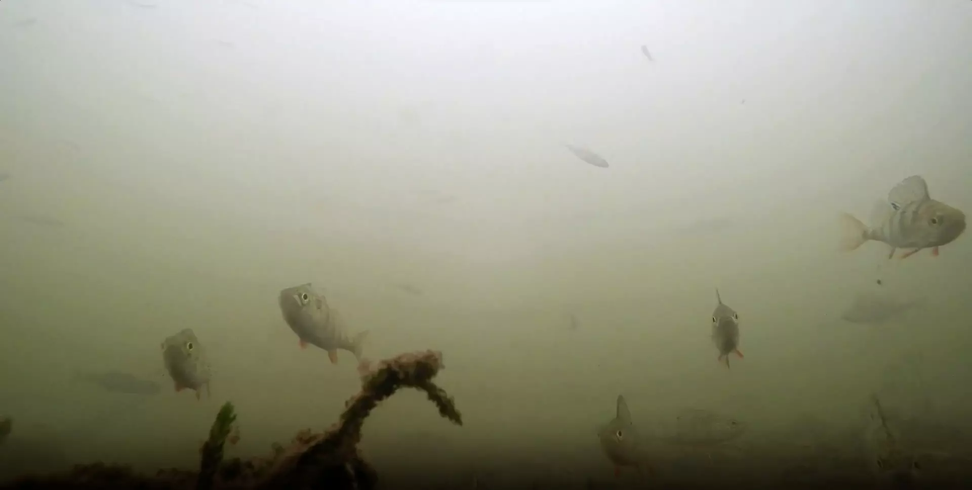 На видео можно наблюдать за тем, как в мутной воде среди водорослей неспешно плавают стаи окуней и единичные щуки, а также более мелкие рыбы.