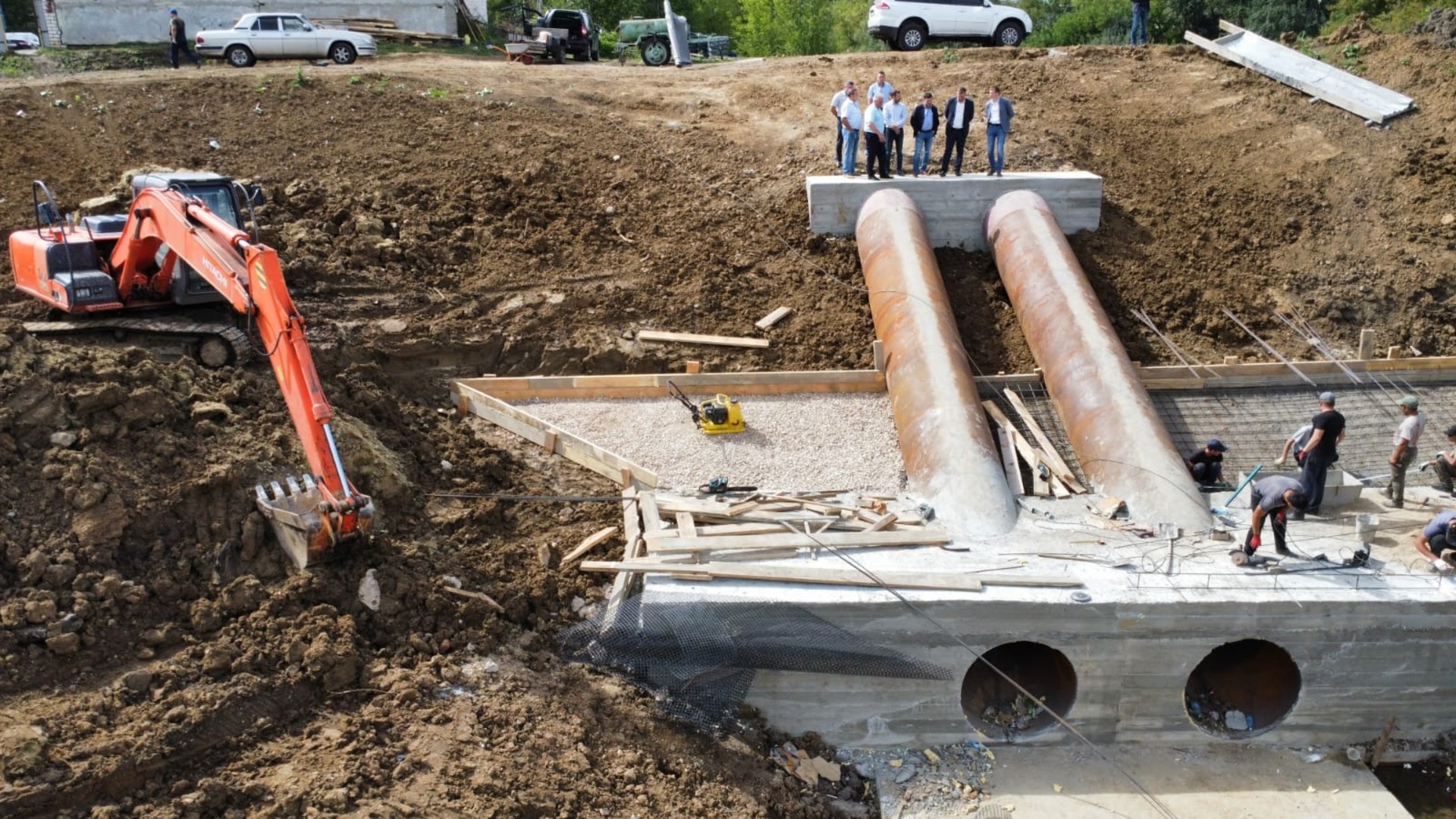 Специалисты уже провели армирование и монтаж двух металлических труб. Забетонировали опорную и водобойную стенки, а также обоймы. Сейчас строители готовятся к работам для железобетонного крепления откосов водобойного колодца.