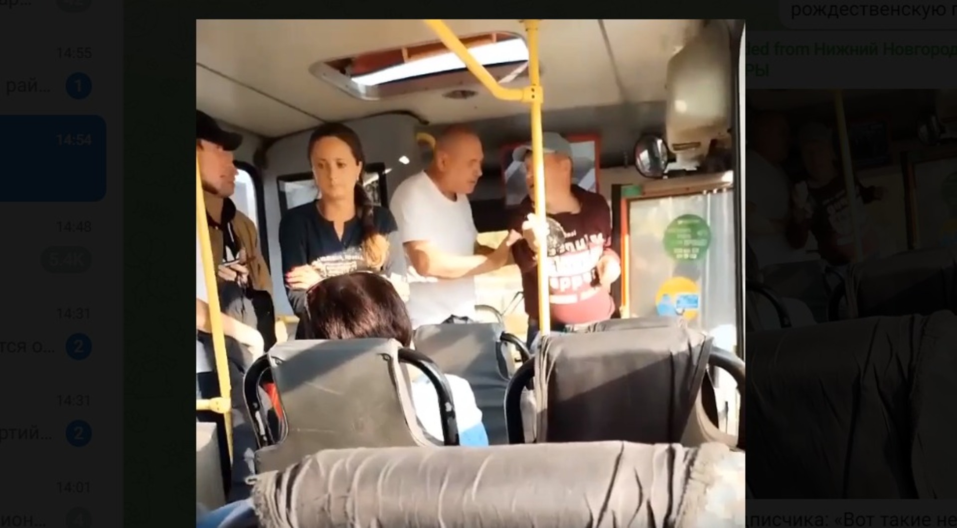 Горожане также распространили видео, на котором в ПАЗике на повышенных тонах общаются два мужчины. Один из них крайне эмоционально требует от другого выйти. А затем толкает человека в открытую дверь.
