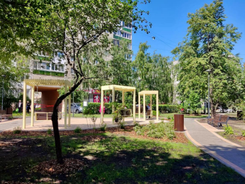 Обновленное и озелененное пространство открыли для посетителей в самом начале улице Культуры. Здесь проложили новые дорожки, установили качели, лавочки и клумбы. Кроме того, на площадке разместили новые фонари – они решат проблему с недостатком освещения в сквере.