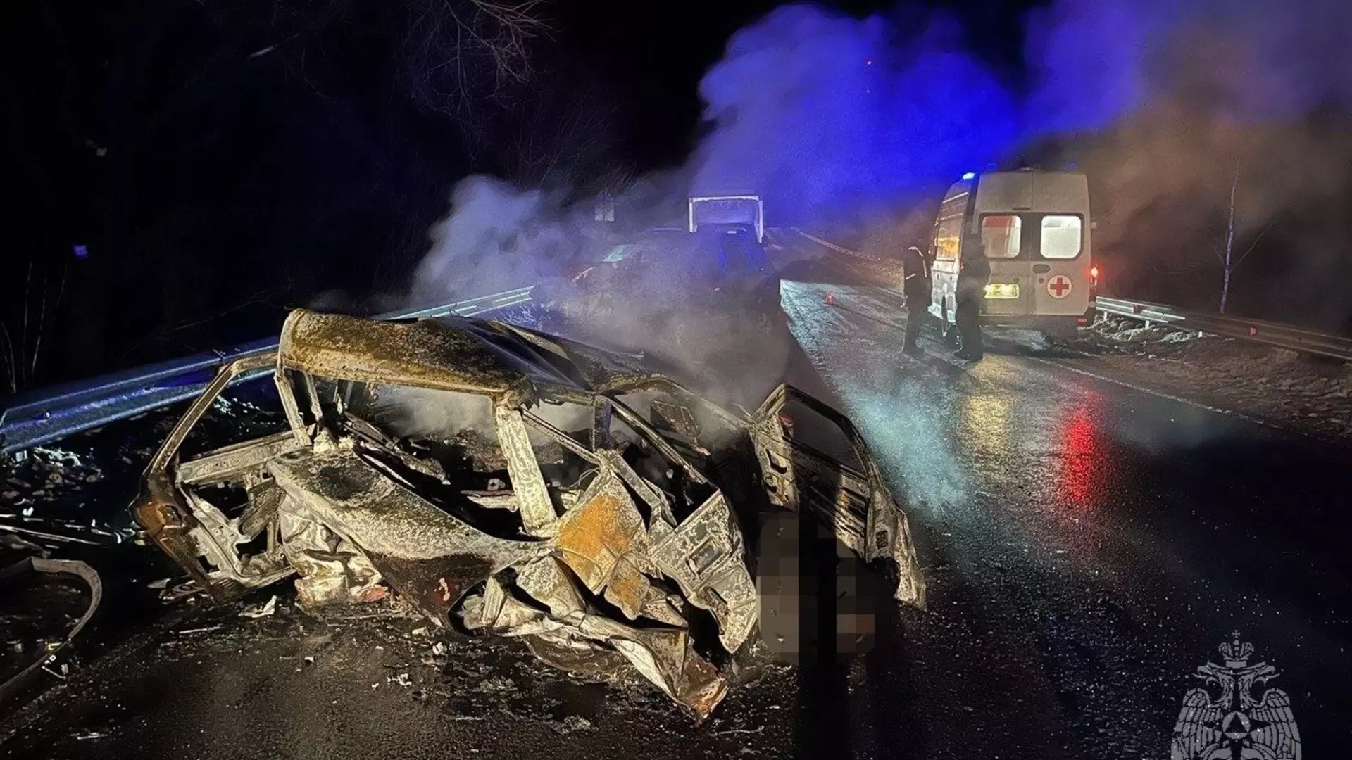 В региональном управлении МЧС рассказали, что после аварии одна из машин загорелась. Сотрудники ведомства потушили возгорание.