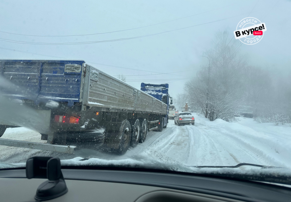 На ул. Ленина и Красные Зори фуры не могли въехать в гору по скользкой дороге, из-за этого скапливались пробки авто.