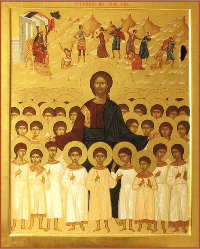 14000 младенцев были убиты царем Иродом в Вифлееме. Когда пришло время совершения величайшего события - Воплощения Сына Божия и Рождения Его от Пресвятой Девы Марии, восточные волхвы увидели на небе новую звезду, предвозвещавшую рождение Царя Иудейского. Тотчас они направились в Иерусалим для поклонения Родившемуся, а звезда указывала им путь. В Иерусалиме они узнали от первосвященников, что Христос по пророчеству должен родиться в Вифлееме. Царь Ирод, выведав от волхвов время появления звезды, приказал им по возвращении все ему рассказать, чтобы и он мог "пойти поклониться Ему". Поклонившись Богомладенцу, волхвы не вернулись в Иерусалим к Ироду, но, получив откровение свыше, ушли в свою страну иным путем. Тогда Ирод понял, что замысел его найти Младенца не осуществился, и приказал убить в Вифлееме и окрестностях всех детей мужского пола от двух лет и младше. Он рассчитывал, что среди убитых детей будет и Богомладенец, в Котором видел соперника (Мф. 2, 1-18).
