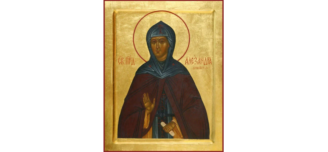 Преподобная Александра (в миру Агафья Семеновна Мельгунова) происходила из Рязани, из древнего дворянского рода. Она рано овдовела и осталась с малолетней дочерью на руках. Приняв монашество в Киево-Флоровском монастыре с именем Александра, она решила посвятить свою жизнь Богу. В Киеве Царица Небесная возвестила матери Александре, что ей предстоит стать основательницей новой великой обители.