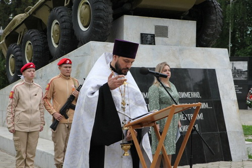 В память о военнослужащих, погибших при исполнении военных обязанностей, была объявлена минута молчания и отслужена заупокойная лития о всех мирно потрудившихся и скончавшихся и на поле брани живот свой за веру и Отечество положивших, которую совершил настоятель Серафимовского храма иерей Андрей Маношкин.