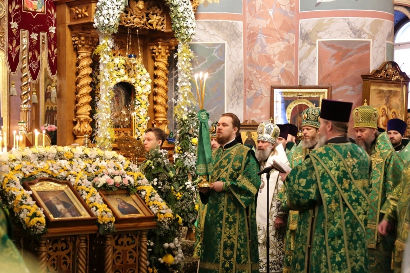 Сегодняшний праздничный день отмечен в Серафимо-Дивеевском монастыре пятью Божественными литургиями. Главные торжества состоялись в Троицком соборе обители. Здесь собор архиереев совершил акафист преподобному Серафиму у его святых мощей, параклис Пресвятой Богородице и позднюю Божественную литургию. Возглавил богослужения митрополит Нижегородский и Арзамасский Георгий. Его Высокопреосвященству сослужили восемнадцать архиереев.