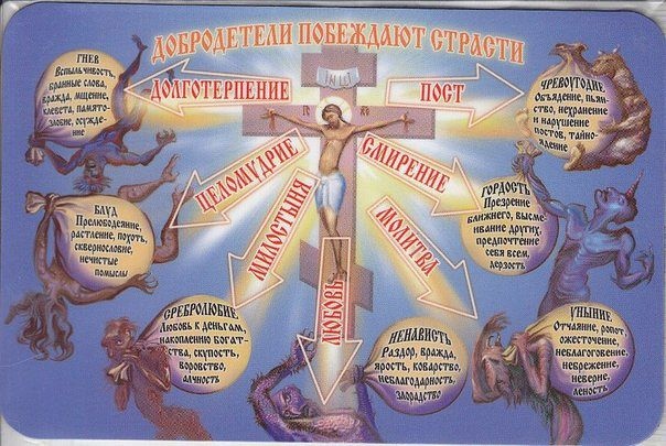 Главных страстей восемь: чревоугодие, блуд, сребролюбие, гнев, печаль, уныние, тщеславие и гордость… Пороки эти разделяются на два рода: на естественные, к которым относятся чревоугодие и блуд; и неестественные, как сребролюбие. Действие их четвероякое. Некоторые из них не могут совершаться без содействия тела, например чревоугодие и блуд; некоторые совершаются без всякого содействия плоти, например тщеславие и гордость. Некоторые из них принимают причины возбуждения отвне, например сребролюбие, гнев, а некоторые от внутренних причин происходят, например уныние и печаль (50,240).