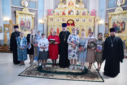 В честь окончания обучения благочинный округа протоиерей Александр Долбунов совершил благодарственный молебен. Сослужили ему духовник курсов иерей Владимир Погодин, руководитель курсов иерей Арсений Семенов и диакон Андрей Лопарев.