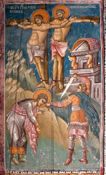 Мученичество Святых Евтропия, Клеоника и Василиска. Фреска монастыря Высокие Дечаны, Косово, Сербия. Около 1350 года.