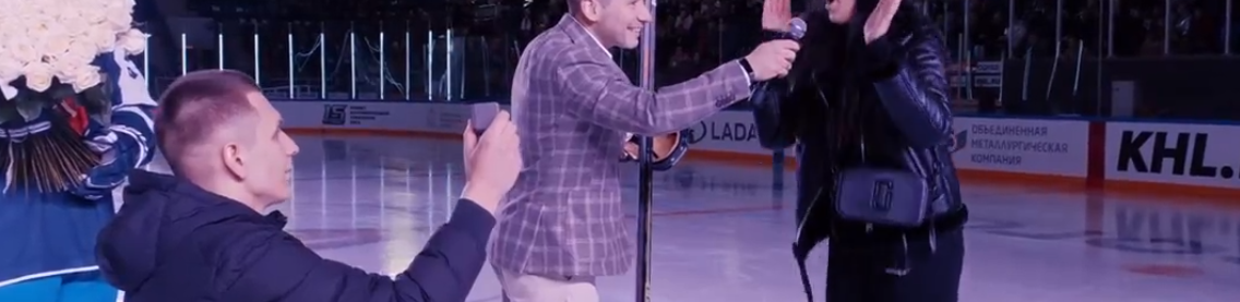 Данила пригласил Алену на лед под предлогом участия в конкурсе. Нужно было шайбой сбить стоящие бутылки, которые стояли в воротах. Однако, когда пока девушка отвернулась, молодой человек достал из кармана обручальное кольцо встал на одно колено, задав заветный вопрос. Она сказала «Да!».