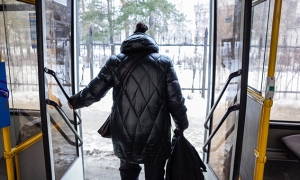 Погода была сырая, троллейбус остановился далеко от бордюра, и людям приходилось вставать в лужу, чтобы сесть в него.